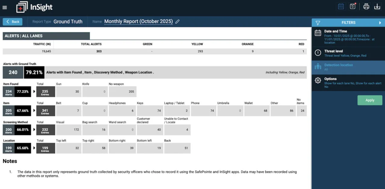 The InSight platform, accessible via a secure web interface, makes it easy to review, analyze, and share SafePointe data across multiple lanes, entrances, and facilities. Each incident can be compiled into a clear, visual report that supports investigations and facilitates internal and external information sharing.