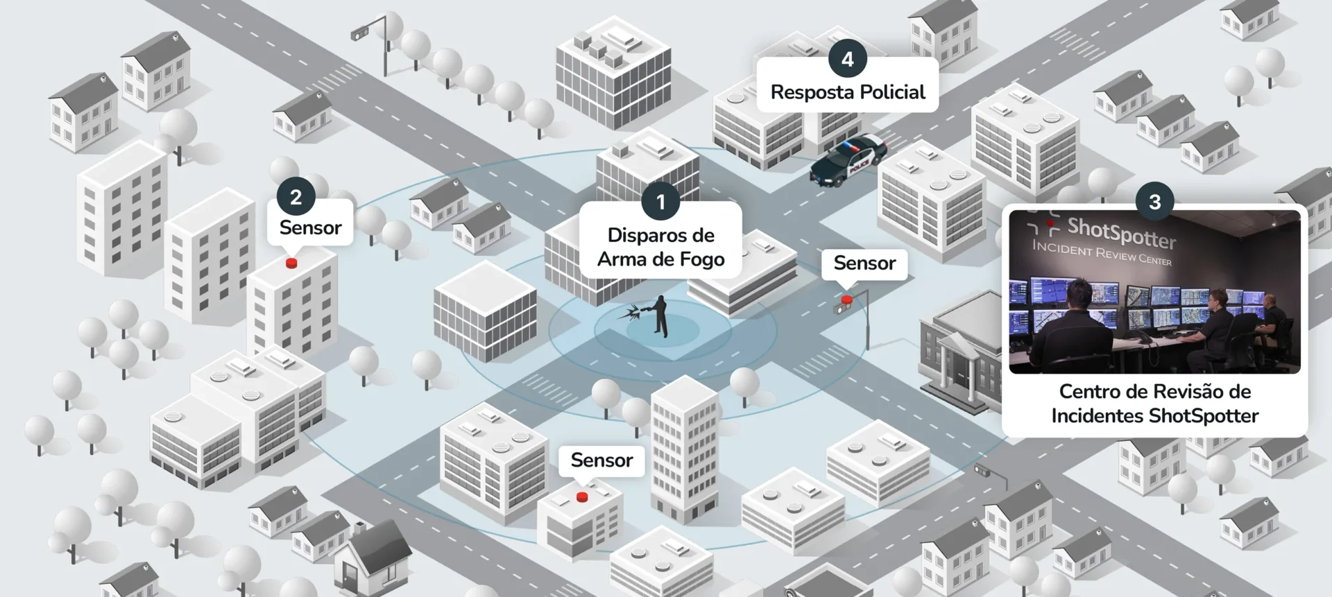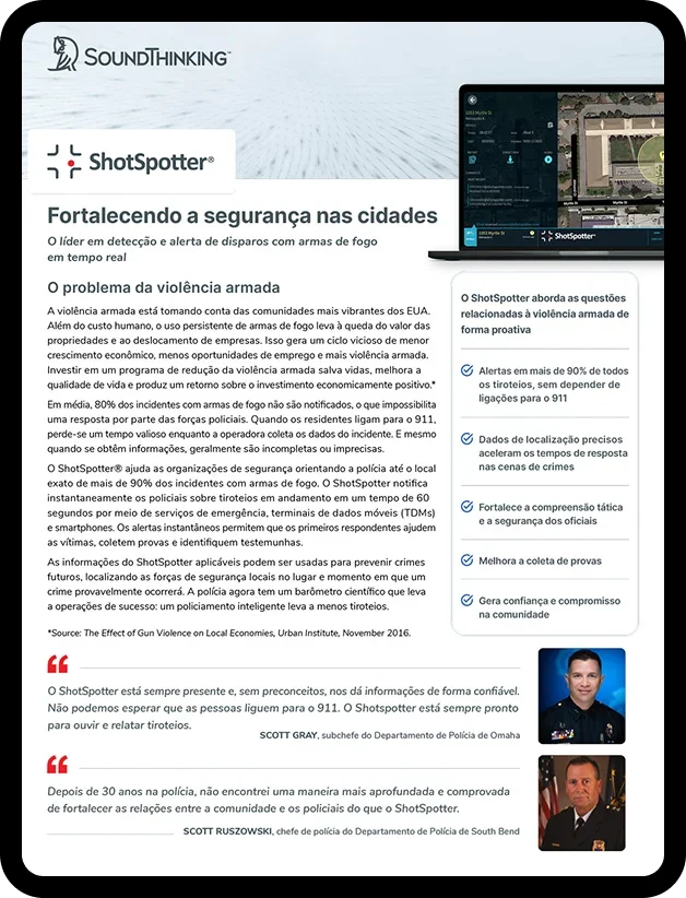 A polícia conta depende das chamadas da comunidade para o 9-1-1 quando há tiros, mas, em média, apenas 20 % dos incidentes são comunicados, criando uma lacuna de dados que dificulta um serviço eficaz. A tecnologia acústica de deteção de tiros ShotSpotter, da SoundThinking, preenche essa lacuna através de uma rede de sensores que detetam, localizam e alertam a polícia para praticamente todos os incidentes com disparos. Presente em mais de 180 cidades, o sistema permite às forças policiais: 1) responder a uma percentagem maior de eventos com tiros; 2) chegar mais depressa ao local para socorrer vítimas e encontrar testemunhas; e 3) recolher provas fundamentais para identificar e investigar suspeitos.